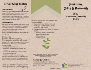 Donations of new and used books, DVDs, music CDs, puzzles and board games are accepted throughout the year. These items are evaluated by library staff for the library’s collection and then given to the Friends of the Germantown Community Library for their sales.