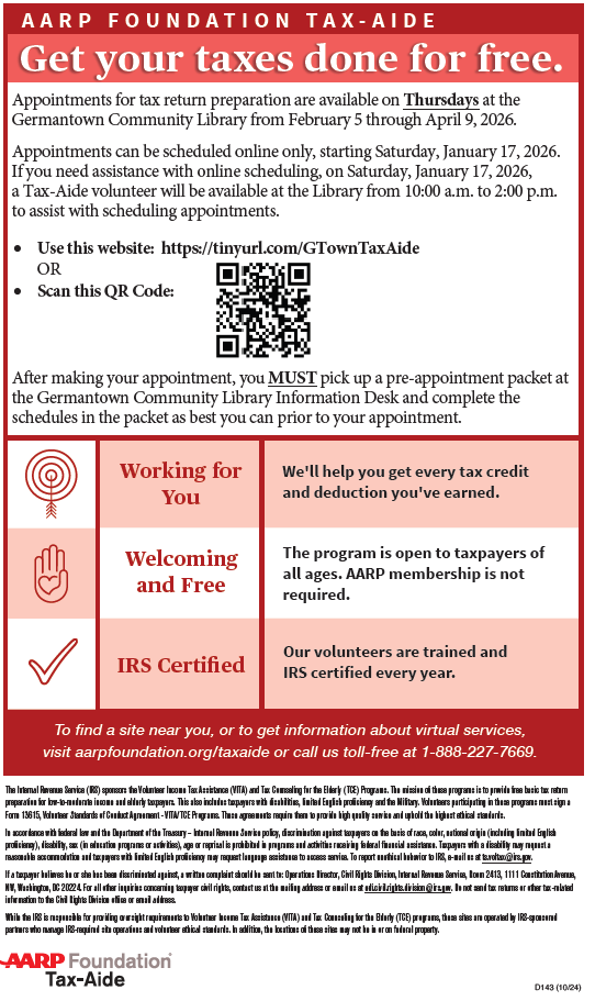 Germantown Community Library is a host site for tax assistance provided by AARP Tax-Aide in 2026. The direct link to make an appointment for tax assistance at Germantown Commmunity Library is here: https://tinyurl.com/GTownTaxAide
